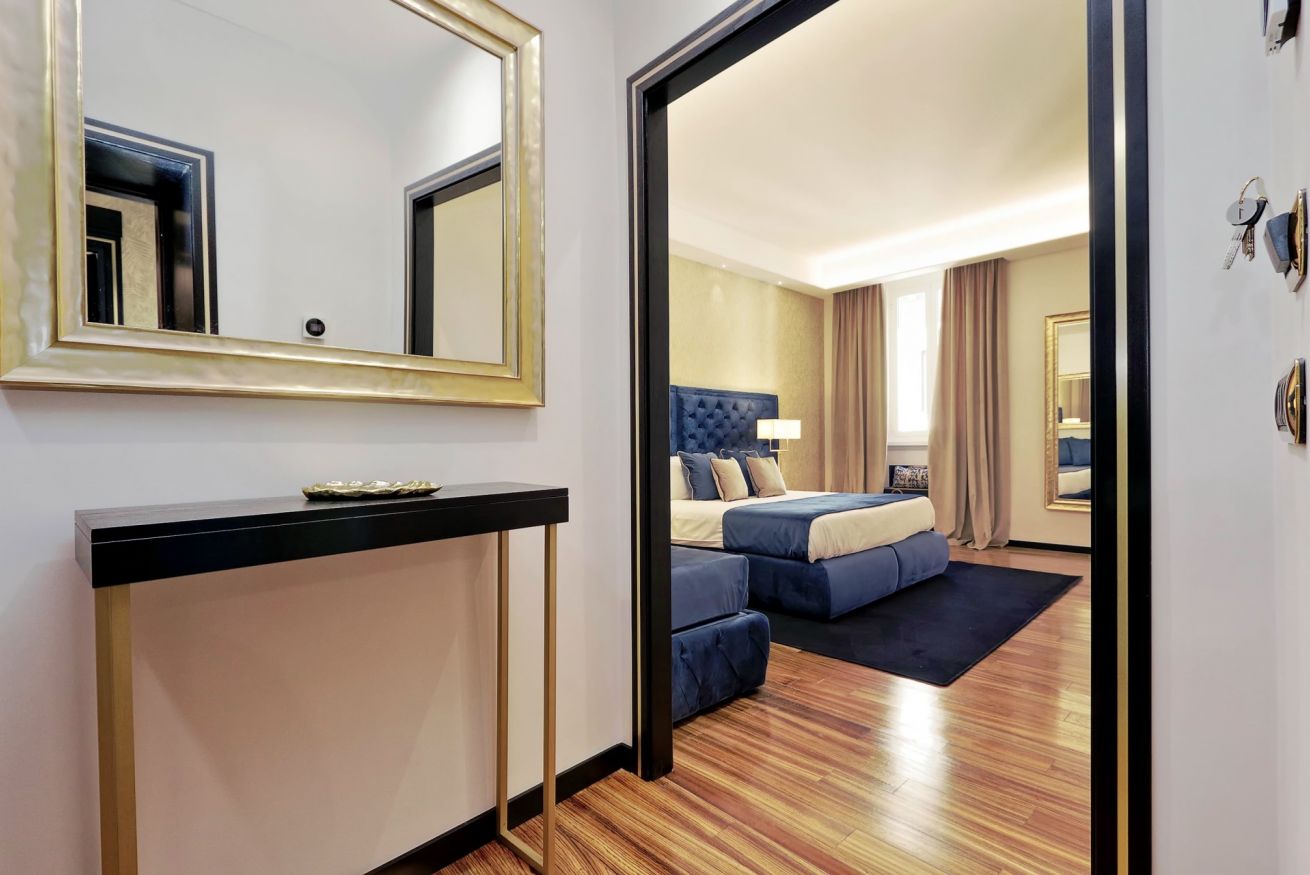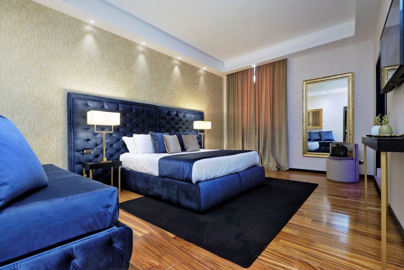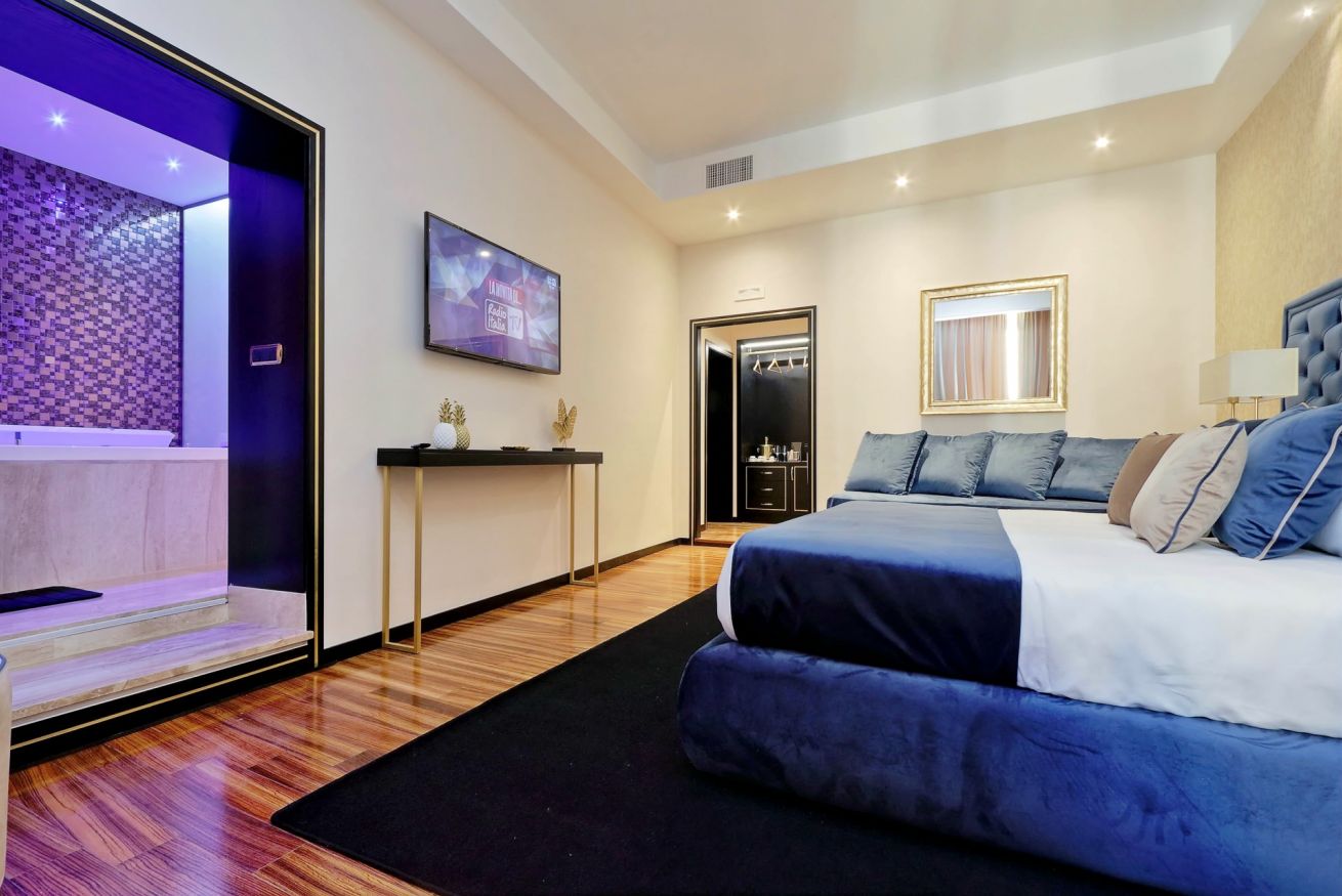 Suite King con letto matrimoniale e possibilità di letto singolo aggiuntivo, 50 mq di lusso e modernità realizzati per rendere unico ogni momento. Sentitevi liberi di vivere un vero e proprio sogno nella modernissima Jacuzzi. Servizi della suite:parquet, aria condizionata, mini bar, cassaforte, 2 televisori LCD, wi-fi privato, bagno con biancheria luxury, jacuzzi e doccia separata.